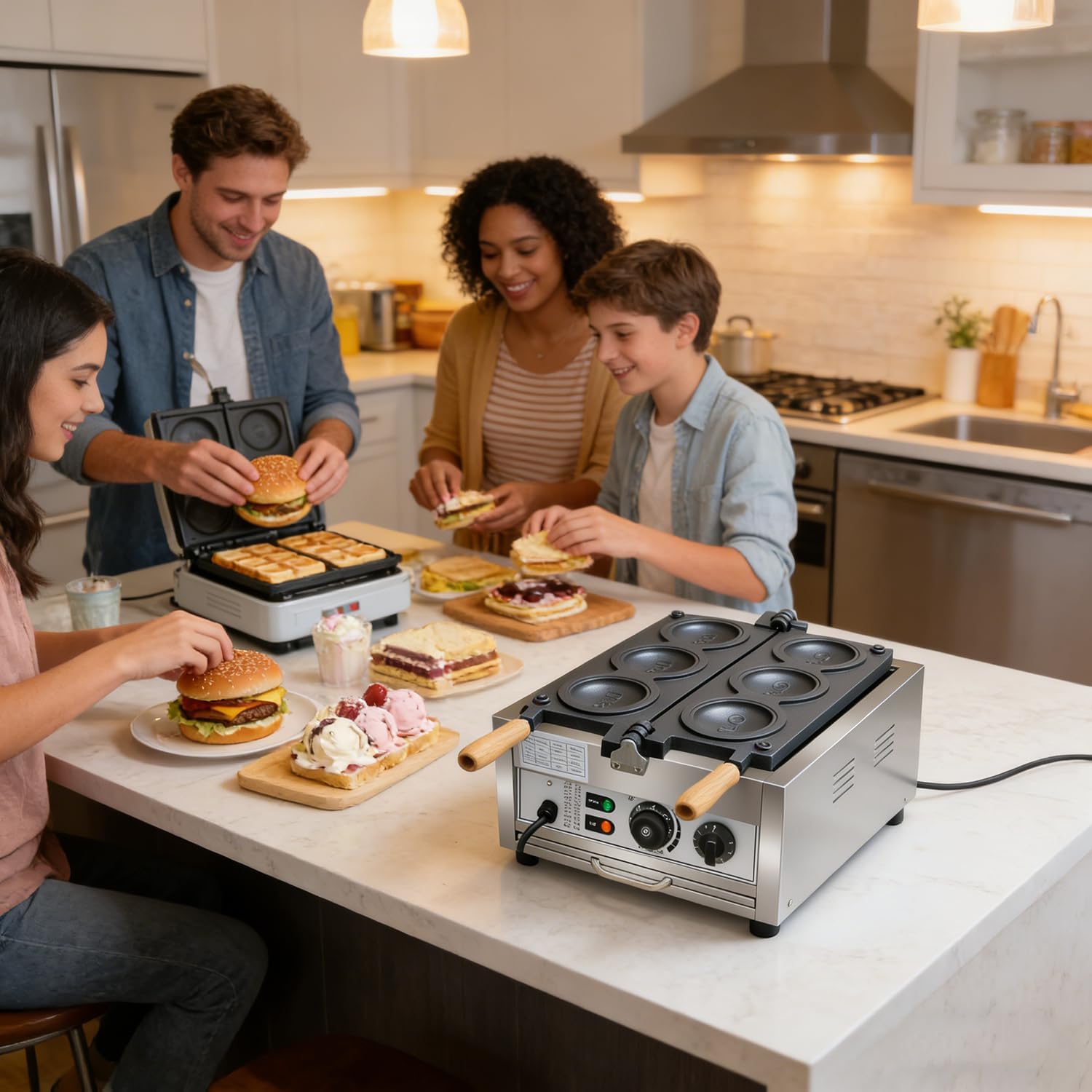 Macchina per hamburger professionale elettrica in acciaio inox con controllo temperatura 50-300°C stampi antiaderenti in alluminio per burger sigillati e ice cream sandwich
