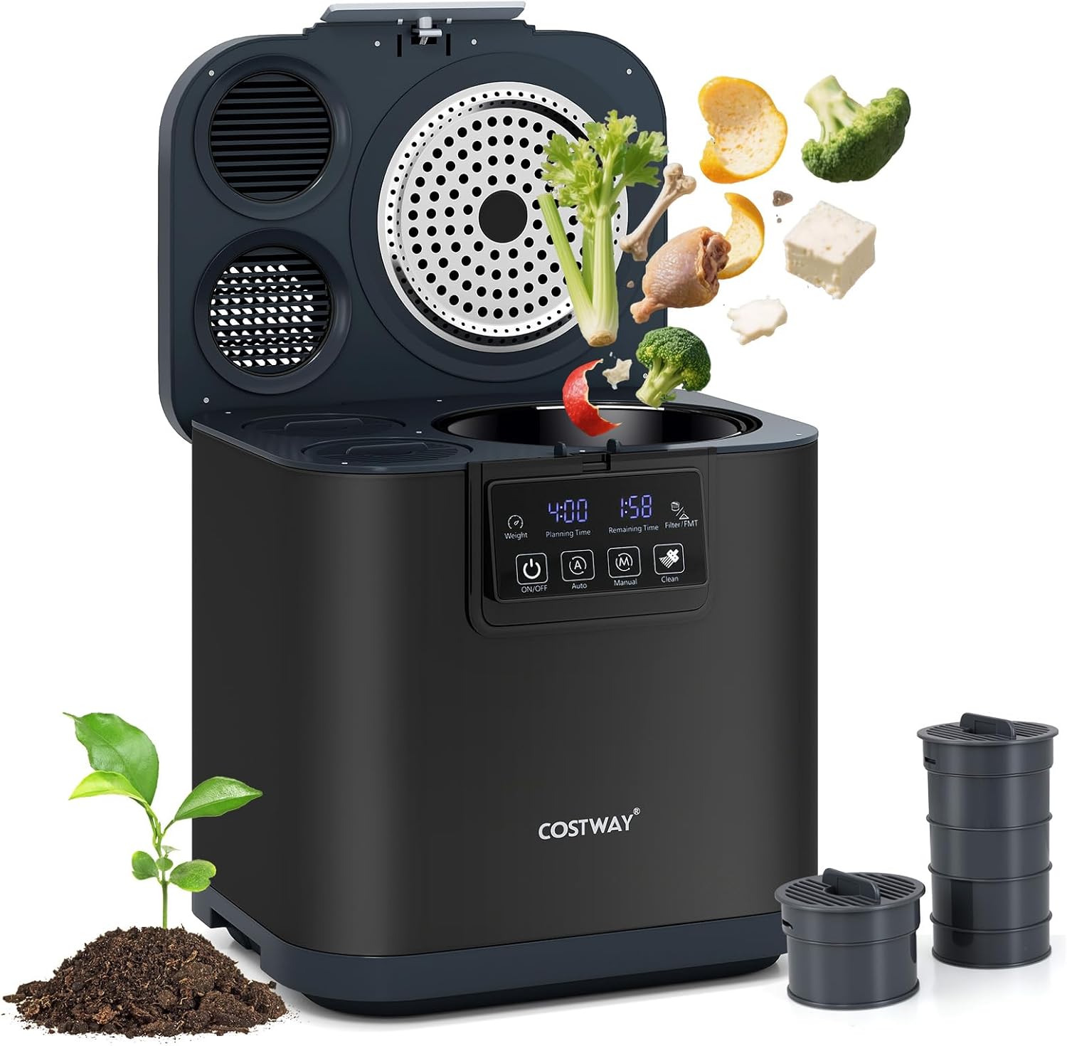 COSTWAY compostiera elettrica da cucina 4 litri nera con coperchio schermo LED pulizia automatica e trasformazione dei rifiuti alimentari in fertilizzante secco