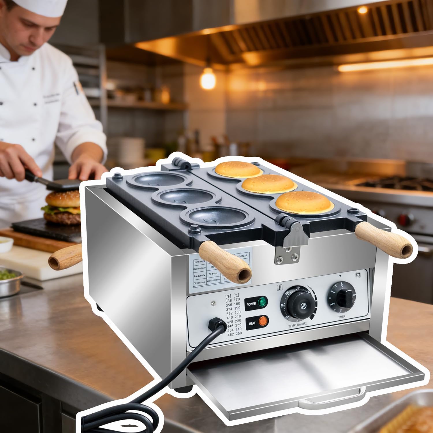 Macchina per hamburger elettrica UFO 2000 W con 6 stampi rotondi in acciaio inox antiaderente e controllo temperatura 50-300 C per ice cream burger e speedy burger da bar