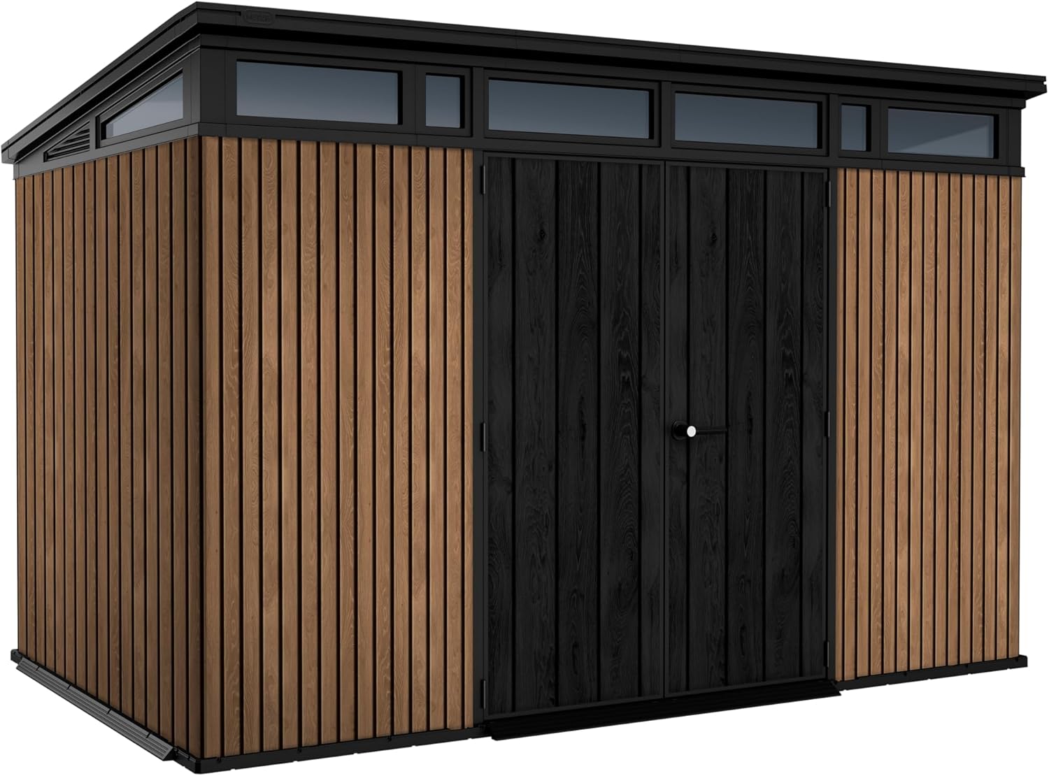 Casetta da giardino Keter Pent 11x7 Venetian progettata per il deposito di attrezzi, accessori e materiali da esterno, con finitura effetto legno naturale a doghe e superficie di circa 7,4 m². Le dimensioni di 340x218x226 cm la rendono adatta a creare uno spazio ampio e ordinato in giardini e cortili residenziali