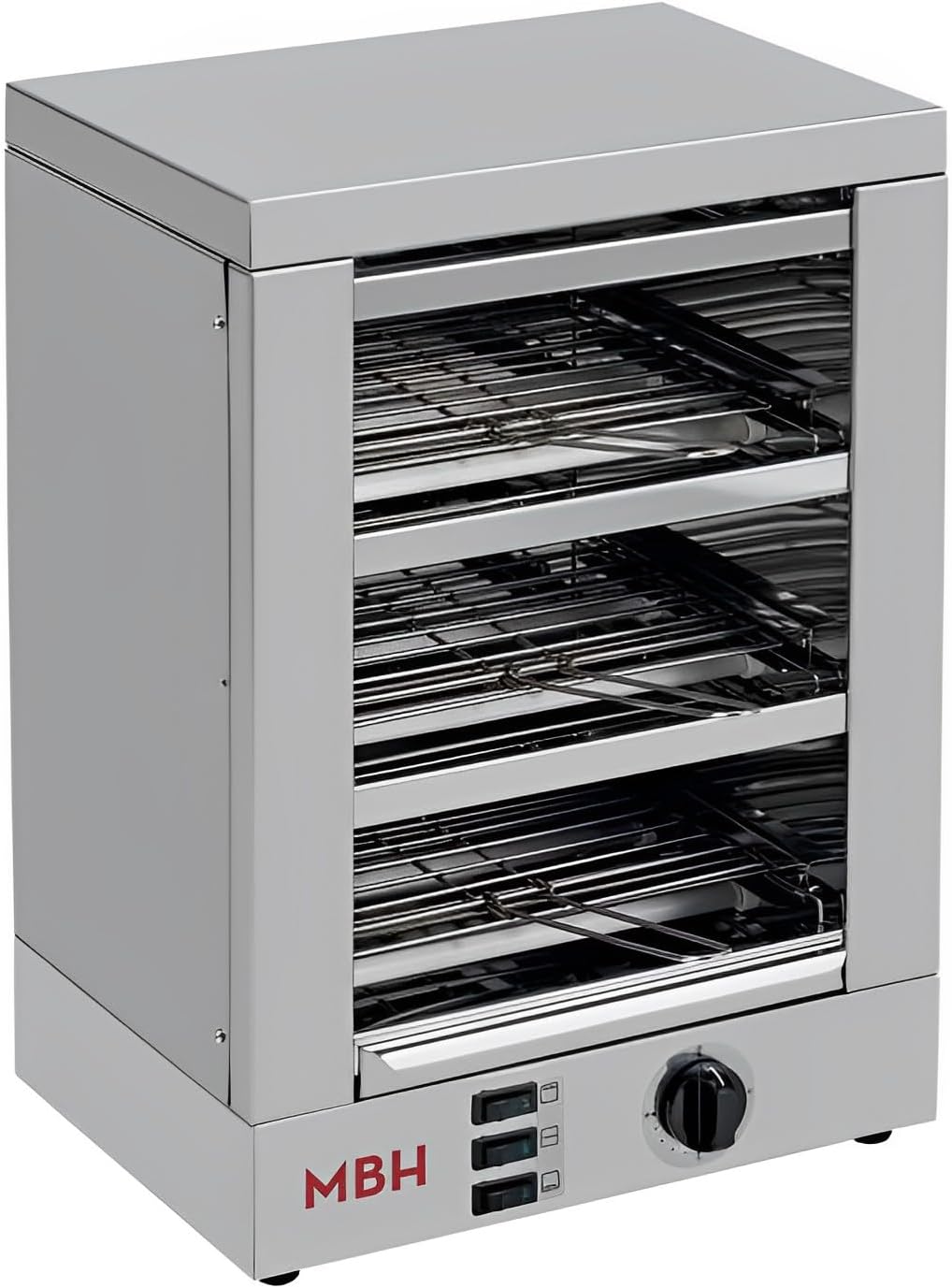 Tostapane professionale MBH a 3 piani progettato per ristorazione, bar, hotel e aree colazione, con struttura in acciaio inox e configurazione elettrica pensata per una tostatura pratica e continua di pane e toast in contesti professionali