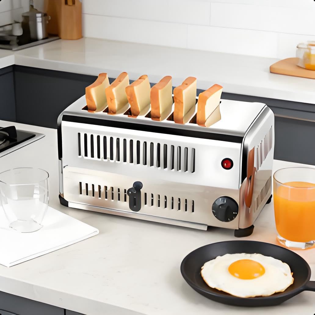 Tostapane professionale a 6 scomparti progettato per la preparazione regolare di pane tostato in cucine domestiche evolute e in ambienti professionali, con struttura in acciaio inox e qualità commerciale pensata per un utilizzo frequente e ordinato